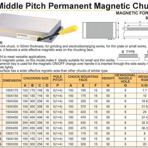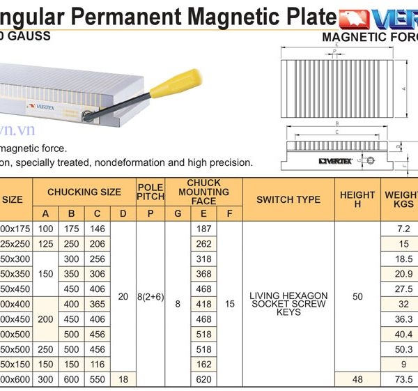 – Bàn từ Vertex có 2 loại: bàn từ nam châm vĩnh cửu và bàn từ điện. Có thể sử dụng cho máy mài và máy phay.
