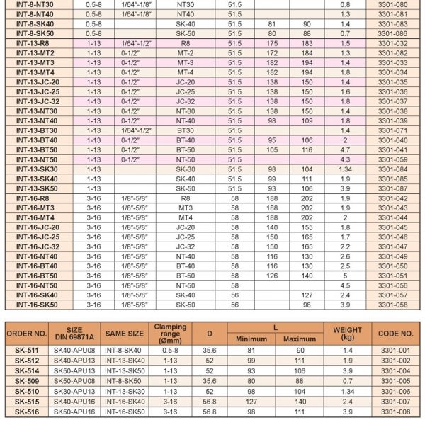 ĐẶC TÍNH SẢN PHẨM BẦU KẸP MŨI KHOAN ĐẦY ĐỦ INT-8-MT-2, INT-8-JC-20, INT-8-BT30, INT-8-BT40, INT-8-NT30, INT-8-NT40, INT-8-SK30, INT-8-SK40, INT-13-R8, INT-13-MT2, INT-13-MT3, INT-13-MT4, INT-13-JC-20, INT-13-JC-25, INT-13-JC-32, INT-13-NT30, INT-13-NT40, INT-13-NT50, INT-13-BT30, INT-13-BT40, INT-13-BT50, INT-13-SK30, INT-13-SK40, INT-13-SK50, INT-16-R8, INT-16-MT3, INT-16-MT4, INT-16-JC-20, INT-16-JC-25, INT-16-JC-32, INT-16-NT40, INT-16-NT50, INT-16-BT40, INT-16-BT50, INT-16-SK40, INT-16-SK50; INT-8-SK40, INT-8-SK50, INT-13-SK40, INT-13-SK50, INT-13-SK30, INT-16-SK40, INT-16-SK50; INT-8-CAT30, INT-13-CAT30, INT-8-CAT40, INT-13-CA40, INT-16-CAT40, INT-13-CAT50, INT-16-CAT50 CỦA VERTEX: