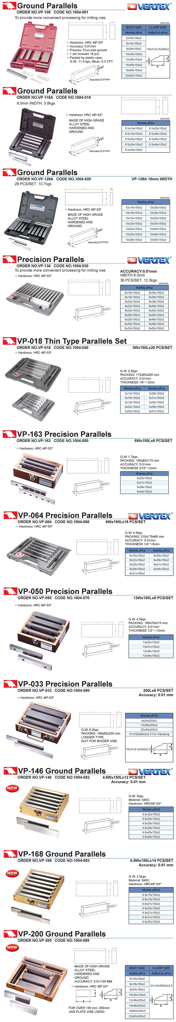 – Bộ căn đệm song song VP-100, VP-118A, VP-128A, VP-136, VP-018, VP-163, VP-064, VP-050, VP-033, VP-146, VP-168, VP-200 của VERTEX sử dụng làm đồ gá căn đệm khi gá kẹp phôi trên máy gia công cơ khí.