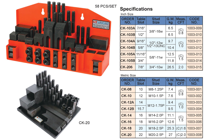– Bộ gá kẹp phôi 52 chi tiết CK-08, CK-10, CK-12A, CK-12B, CK-14, CK-16, CK-18, CK-20, CK-103A, CK-103B, CK-104A, CK-104B, CK-105A, CK-105B, CK-206 VERTEX là đồ gá thông dụng dùng gá kẹp phôi trên bàn máy.