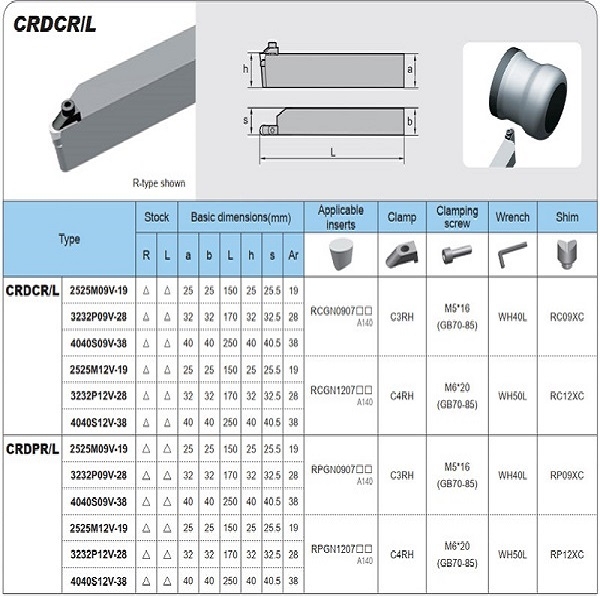 - Cán dao tiện tròn vật liệu cứng CRDCR/L được sử dụng kết hợp phổ biến với chíp tiện RCGN0907; RCGN1207; RPGN0907; RPGN1207. Dùng tiện biên dạng tròn ngoài.