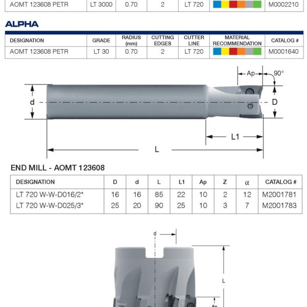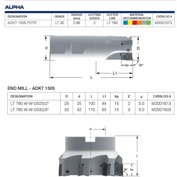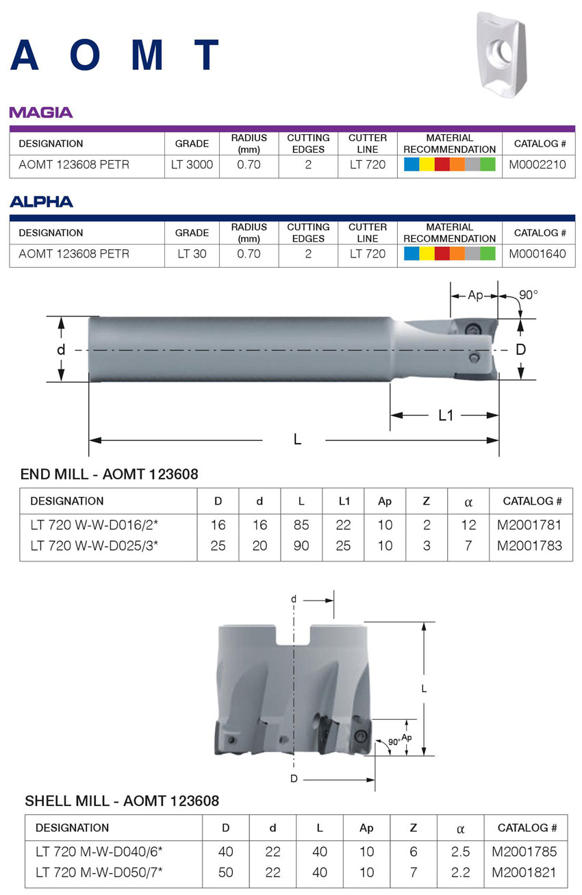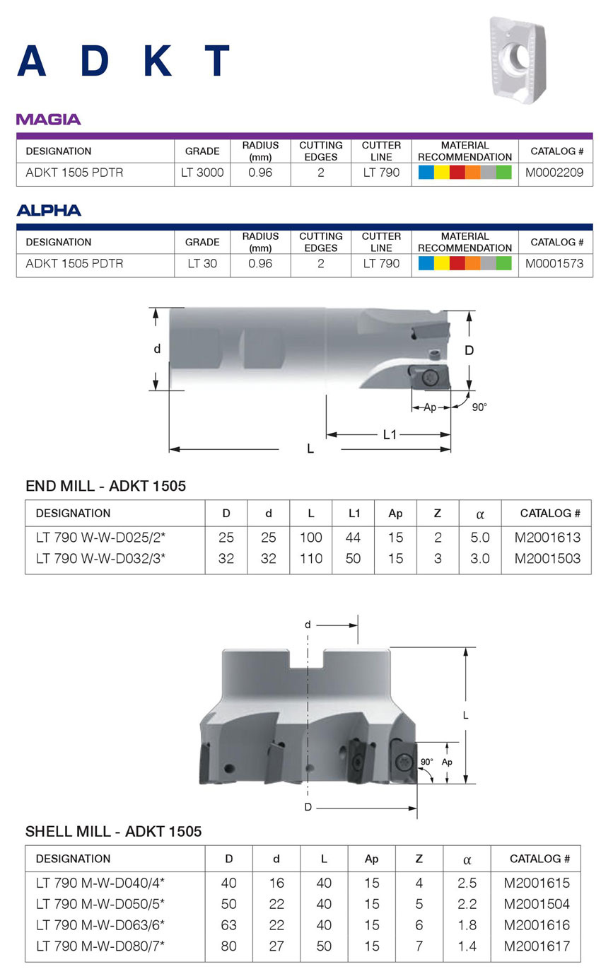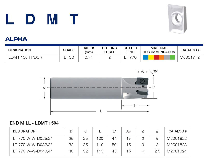 – Sử dụng các mảnh phay APKT 060204; APKT 100304; APKT 100308; APKT 100312; APKT 100316; APKT 100332; APKT 100340; APKT 1604; APKT 160408; APKT 160416; APKT 160424; APKT 160432; APKT 1705; ADKT 1505; AOMT 123608; APMT 0903; APMT 1135; APMT 1604; APMT 160408; TPKN 1603; TPKN 2204; TPKR 1603; TPKR 2204; TPUN 160308; LDMT 1504; SPMT 12T308 của LAMINA.
