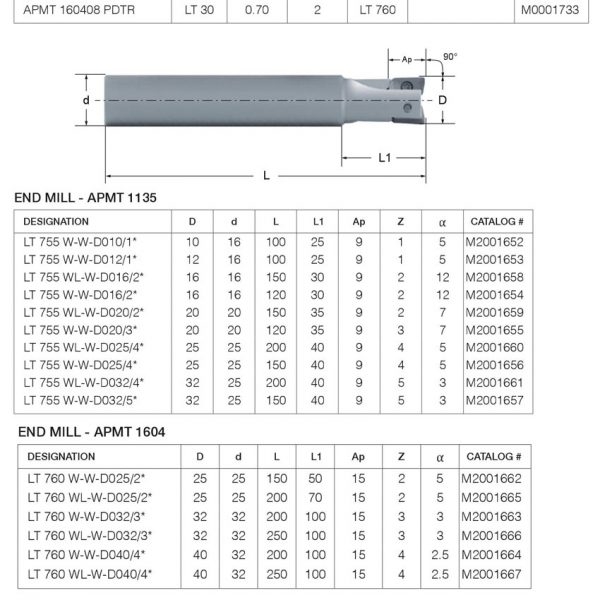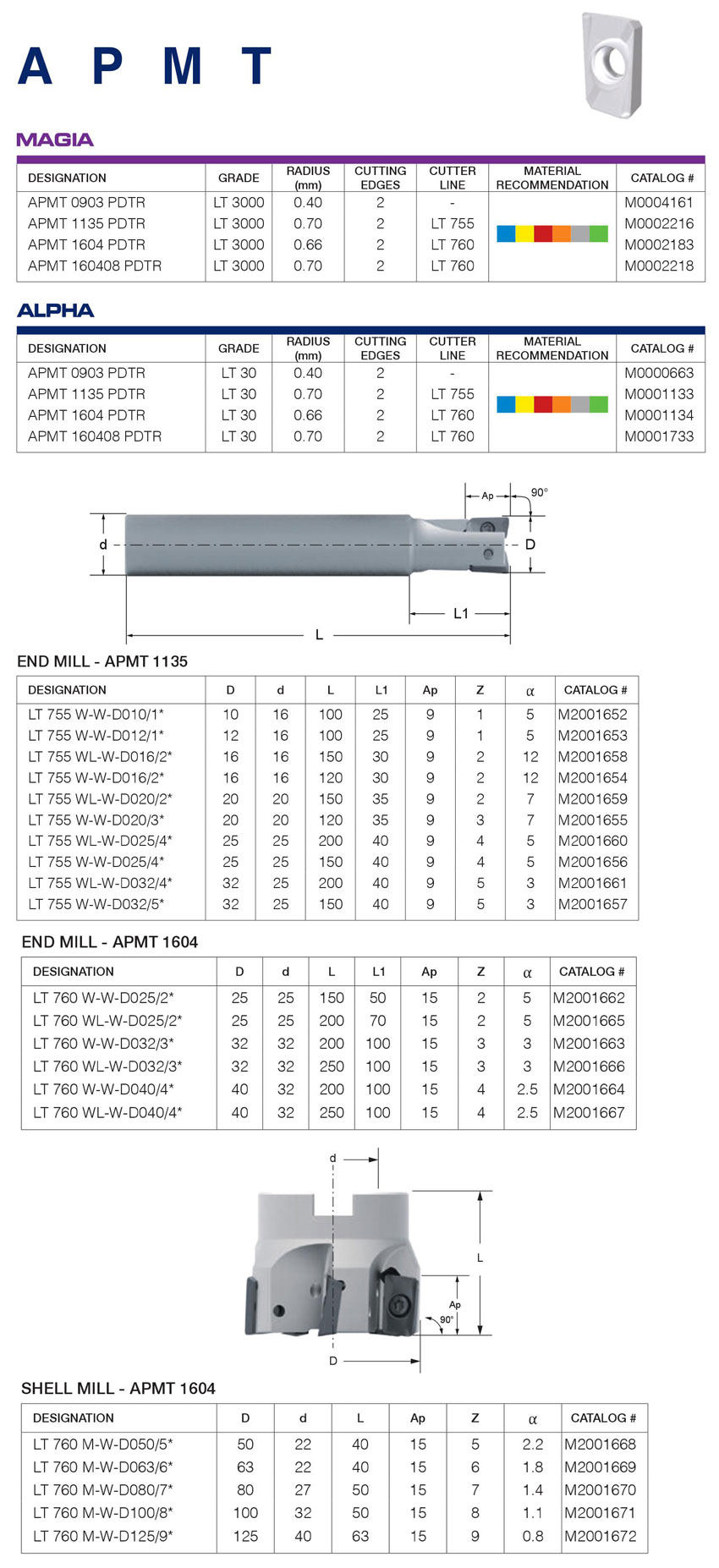 Dao phay góc 90° sử dụng mảnh phay APMT: APMT 0903; APMT 1135; APMT 1604; APMT 160408.