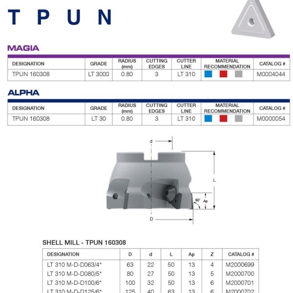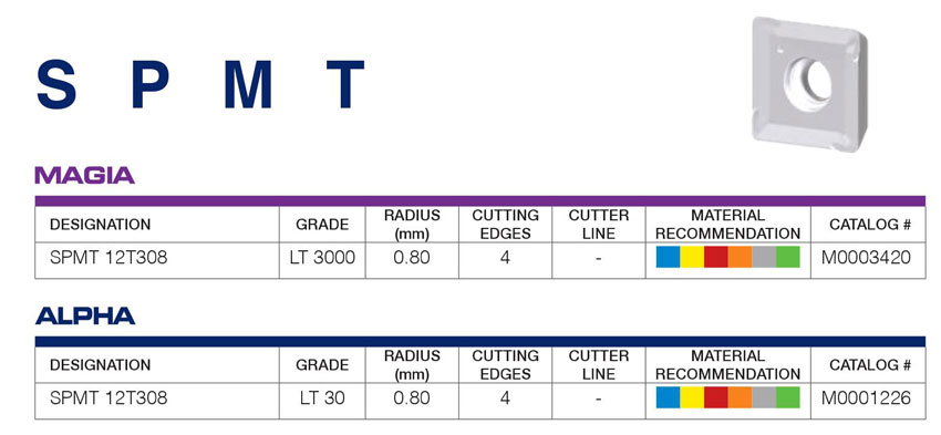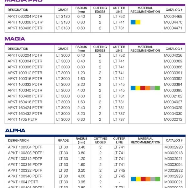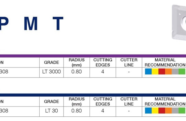 – Lớp phủ “LT 30 (Alpha); LT 3000 (Magia)” được phủ theo công nghệ PVD và CVD, cho độ cứng cao, chống mài mòn tốt, tuổi bền mảnh dao cao. Lớp phủ LT 3130 (Magia pro) được sử dụng chuyên cho thép và inox với tốc độ cắt cao.