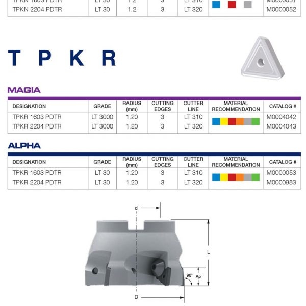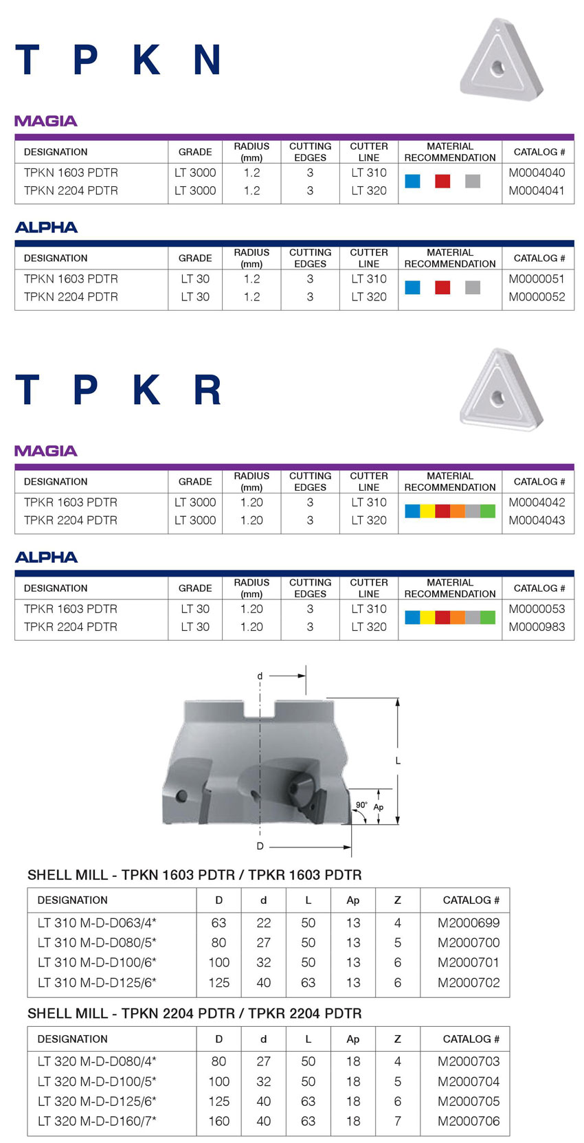 Dao phay góc 90° sử dụng mảnh phay TPKN, TPKR và TPUN: TPKN 1603; TPKN 2204; TPKR 1603; TPKR 2204; TPUN 160308.
