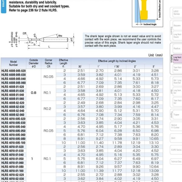 – Dao phay góc cổ dài hợp kim HLRS4000 của Union Tool – Nhật Bản chuyên dùng phay khuôn mẫu sau nhiệt có độ cứng cao từ 40HRC – 65HRC, bao gồm các vật liệu như: NAK, HPM, STAVAX, SKD11, HAP10, HAP72,…