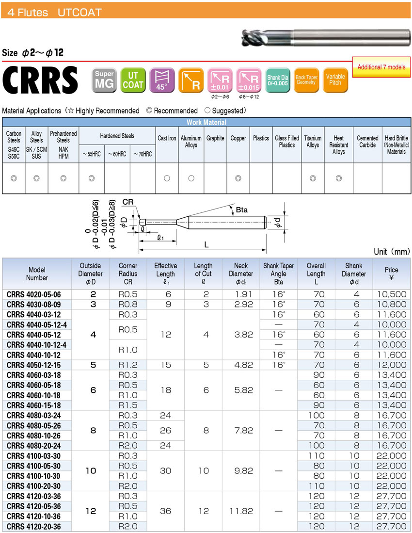 – Dao phay góc hợp kim CRRS chuyên phay tinh và bán tinh cho khuôn mẫu với vật liệu đồng, hợp kim nhôm, nguyên liệu thô và thép có độ cứng <55HRC: S45C, S50C, SK, SCM, NAK80, STAVAX, HPM38, SKD61,…