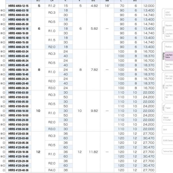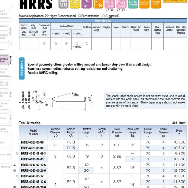 – Dao phay hợp kim HRRS của Union Tool – Nhật Bản chuyên dùng phay khuôn mẫu sau nhiệt có độ cứng cao từ 40HRC – 65HRC, bao gồm các vật liệu như: NAK, HPM, STAVAX, SKD11, HAP10, HAP72,…