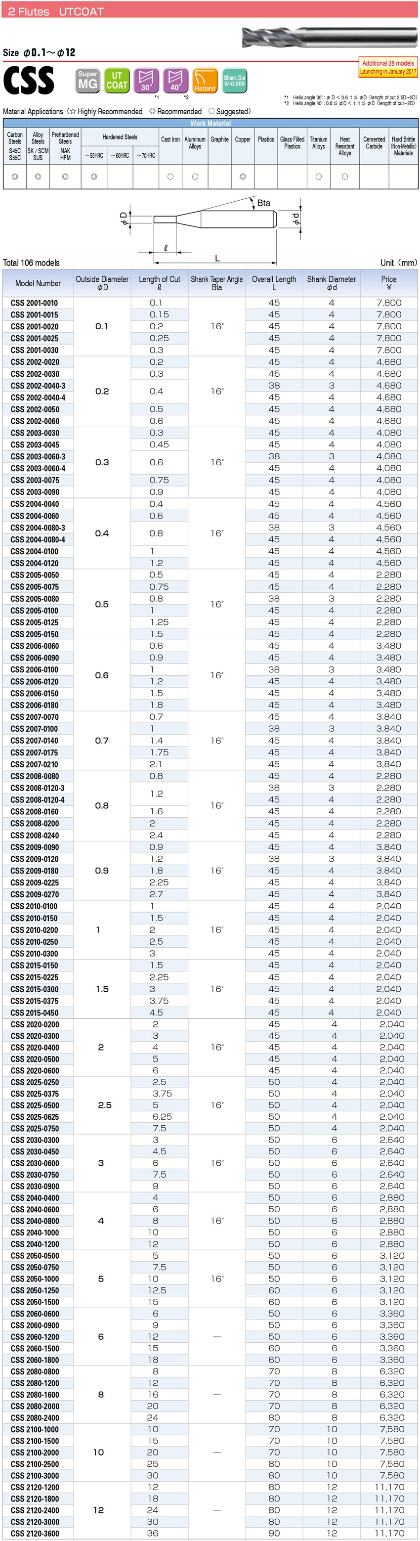 – Dao phay ngón hợp kim CSS chuyên dùng phay đồng và thép có độ cứng < 55HRC; các mác vật liệu như: thép carbon (S45C, S55C); thép hợp kim (SK, SCM, SUS); thép nhiệt luyện (NAK, HPM); gang đúc; đồng; hợp kim Titan; hợp kim chịu nhiệt.