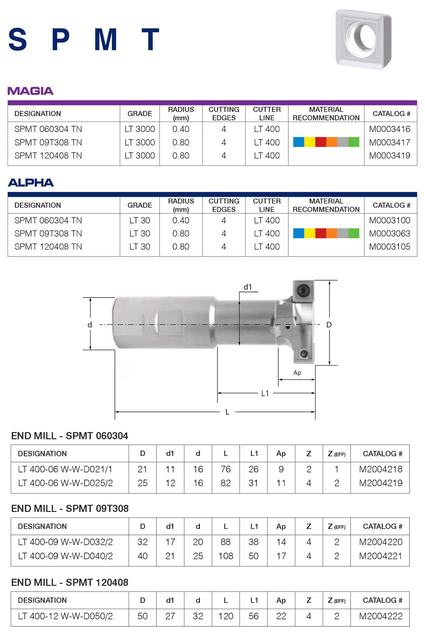 – Sử dụng các mảnh phay vuông: SPMT 060304 TN; SPMT 09T308 TN; SPMT 120408 TN của LAMINA. Mỗi mảnh dao sử dụng được 4 góc cắt.