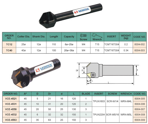 – Dao phay vát mép 45° ghép mảnh VERTEX: TC12, TC40, VCE-4521, VCE-4531, VCE-4550, VCE-4532, VCE-4563 được sử dụng phay vát mép 45° các cạnh góc và miệng lỗ.