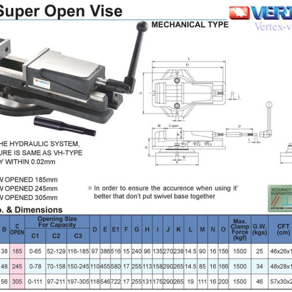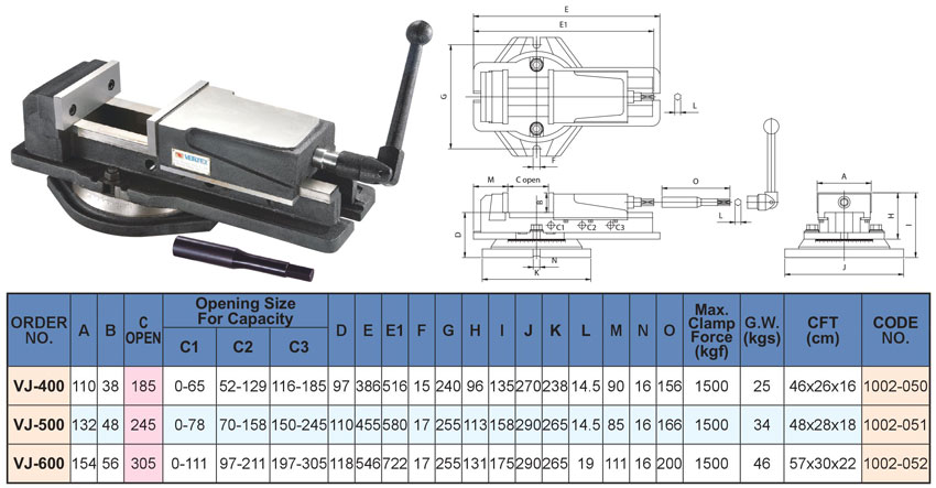 – Ê tô máy phay VJ: VJ-400, VJ-500, VJ-600 có độ mở rất lớn. Độ mở tối đa từ 185 đến 305 mm.