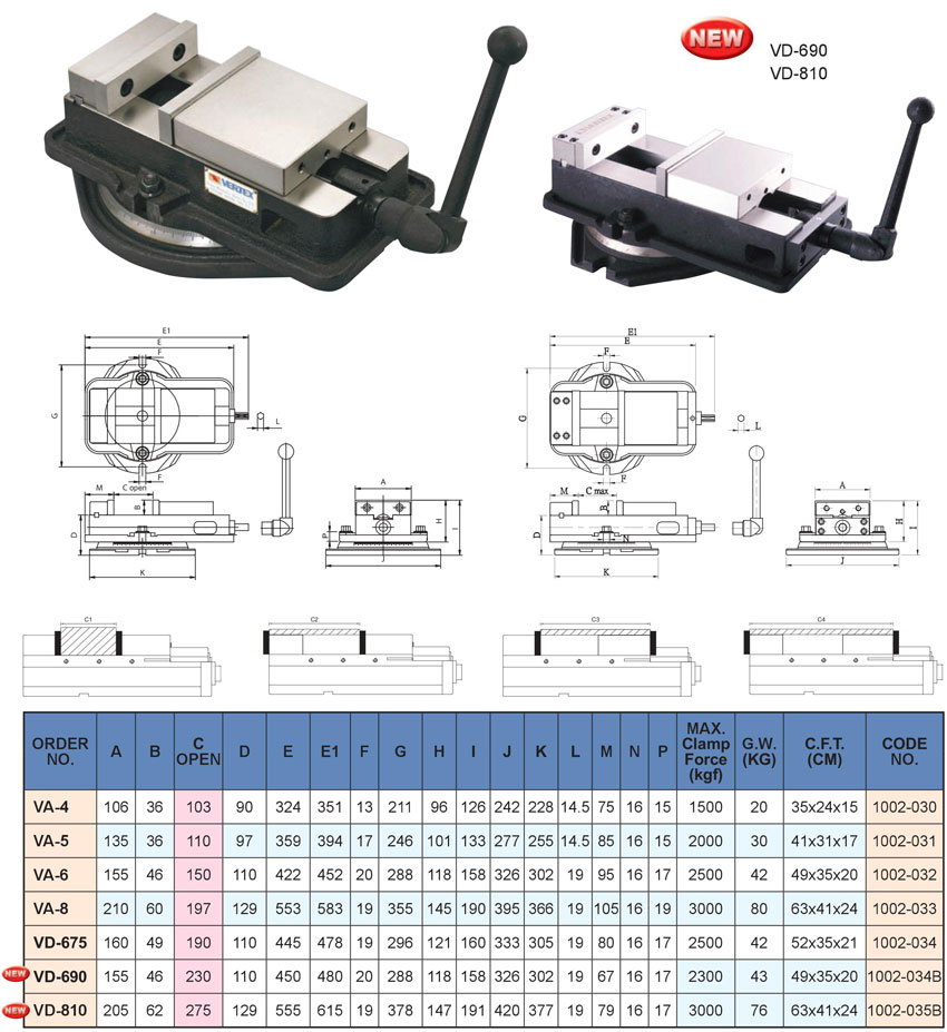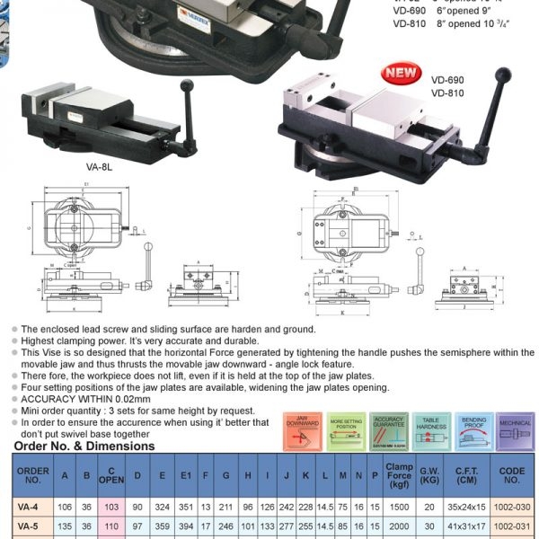 – Ê tô máy phay VA có lực kẹp lớn hơn, bền hơn các ê tô máy phay cơ khí cùng loại. Có rãnh dẫn dung dịch tưới nguội.