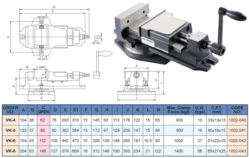– Ê tô máy phay cơ khí kiểu K: VK-4, VK-5, VK-6, VK-8 được sử dụng phổ biến với độ mở tối đa từ 42 đến 146 mm. Các model không bao gồm đế xoay tròn 360° tương ứng là: VK-4-1, VK-5-1, VK-6-1, VK-8-1.
