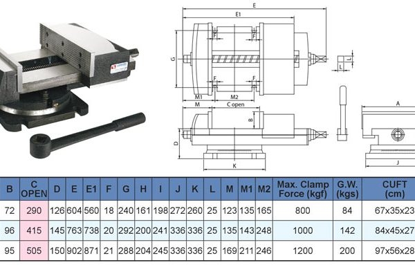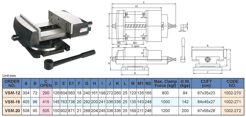 – Ê tô máy phay VSM: VSM-12, VSM-16, VSM-20 là dòng ê tô kích thước lớn. Độ mở tối đa lên đến từ 290 đến 505 mm.