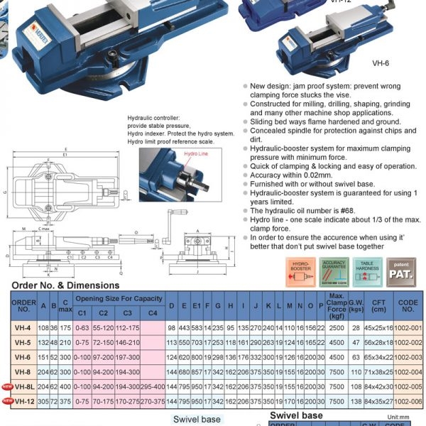– Ê tô thủy lực VH khi đặt hàng đã bao gồm đế xoay 360°. Các model ê tô thủy lực VH khi mua không bao gồm đế tương ứng là: VH-4-1, VH-5-1, VH-6-1, VH-6L-1, VH-8-1, VH-8L-1, VH-12-1.