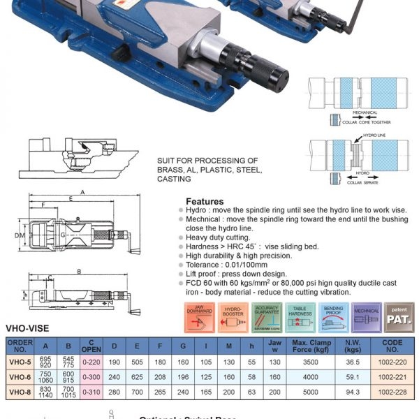 – Ê tô thủy lực VHO thích hợp kẹp chi tiết đồng, nhôm, nhựa, thép và gang.