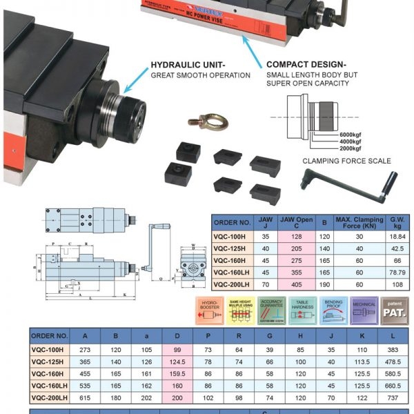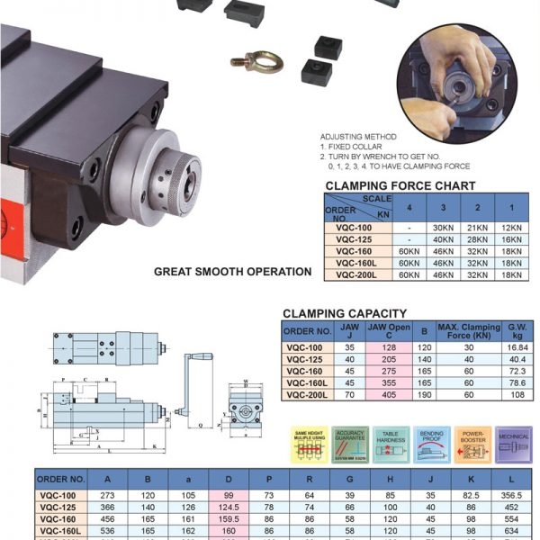– Ê tô thủy lực VQC-H có 3 vạch điều chỉnh lực thủy lực. Tỉ lệ mỗi vạch là 1/3 lực kẹp lớn nhất. Lực kẹp lớn nhất tra theo bảng của sản phẩm.