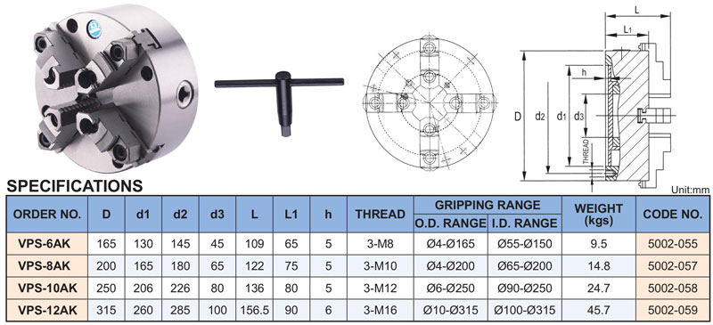 3. Mâm cặp 4 chấu máy tiện tự định tâm VPS-6AK, VPS-8AK, VPS-10AK, VPS-12AK Vertex: