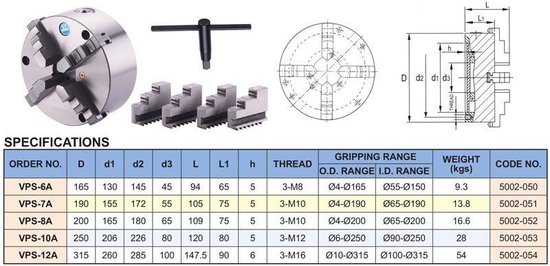 2. Mâm cặp 4 chấu máy tiện tự định tâm VPS-6A, VPS-8A, VPS-10A, VPS-12A Vertex: