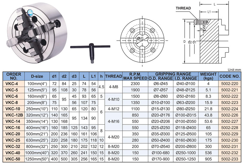 1. Mâm cặp 4 chấu máy tiện độc lập VKC-4, VKC-5, VKC-6, VKC-8, VKC-10, VKC-12B, VKC-14, VKC-16, VKC-20, VKC-25, VKC-32, VKC-40, VKC-50: