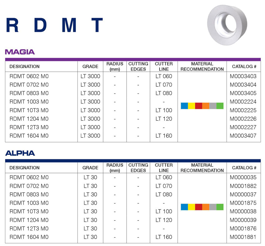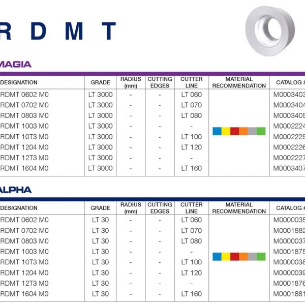 – Các mảnh phay RDMT 0602 M0; RDMT 0702 M0; RDMT 0803 M0; RDMT 1003 M0; RDMT 10T3 M0; RDMT 1204 M0; RDMT 12T3 M0; RDMT 1604 M0 của LAMINA có thể phay được các vật liệu: thép; inox; gang; hợp kim chịu nhiệt (titan, inconel); thép sau nhiệt luyện; nhôm, đồng,… (vật liệu phi kim loại).