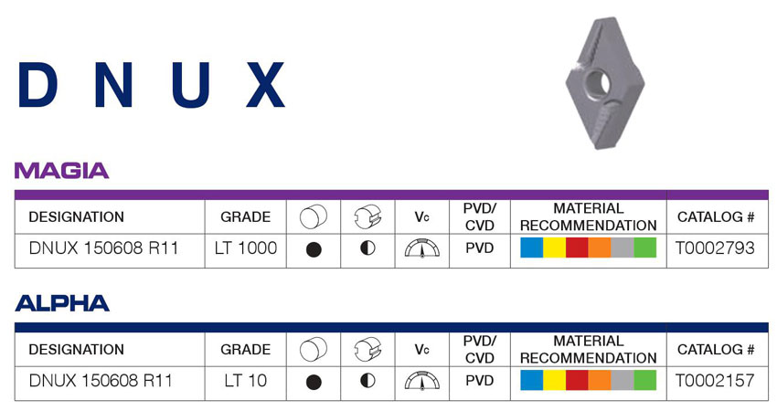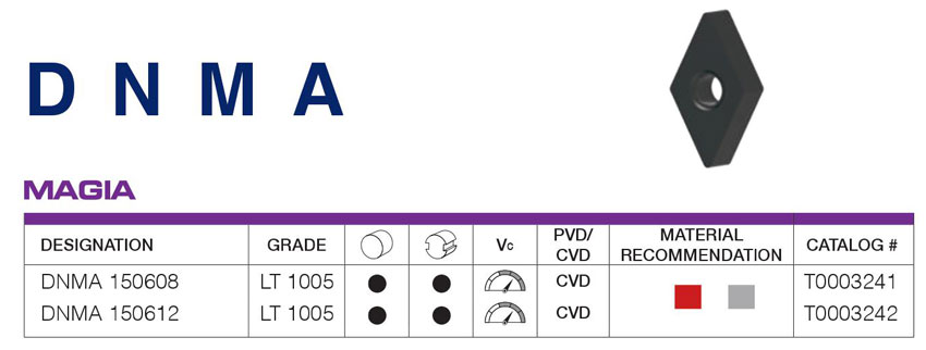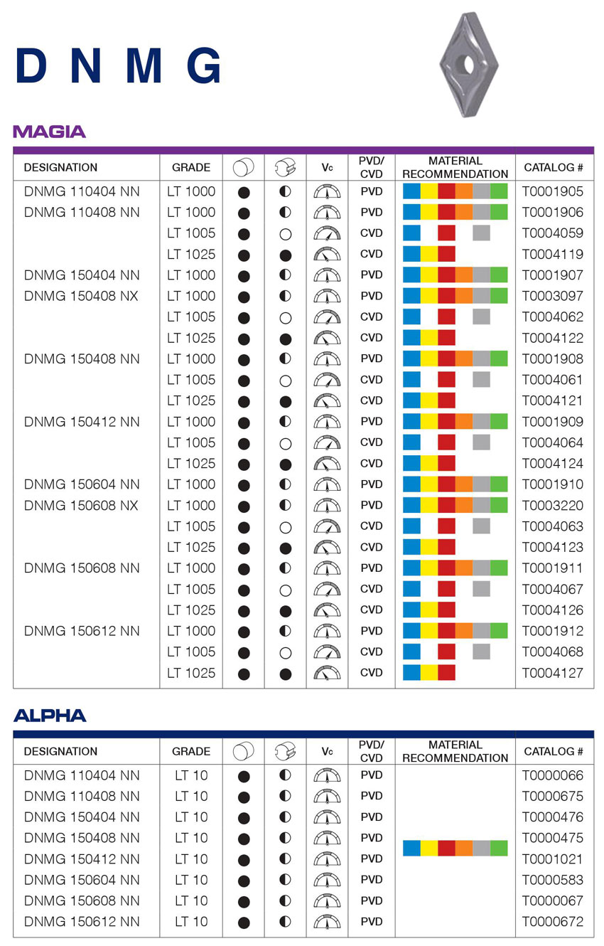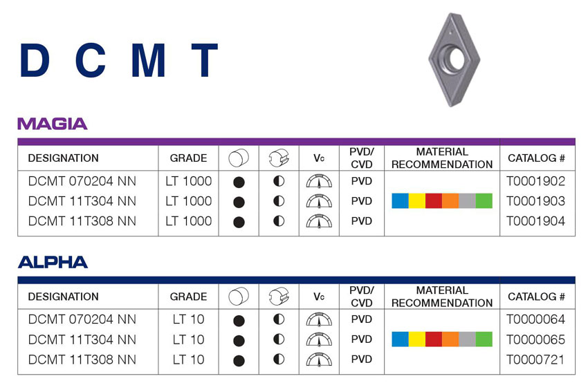 – Các mảnh tiện DCMT; DNMA; DNMG; DNUX của LAMINA có thể tiện được các vật liệu: thép; inox; gang; hợp kim chịu nhiệt (titan, inconel); thép sau nhiệt luyện; nhôm, đồng,… (vật liệu phi kim loại).