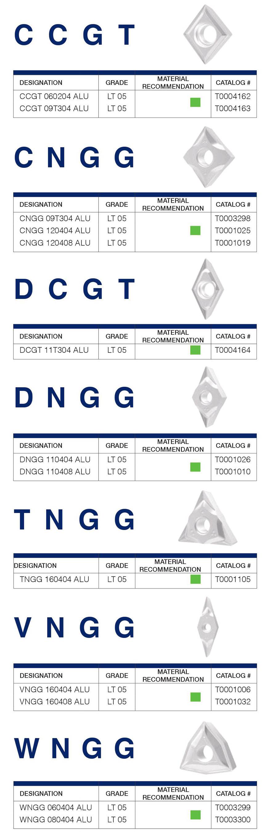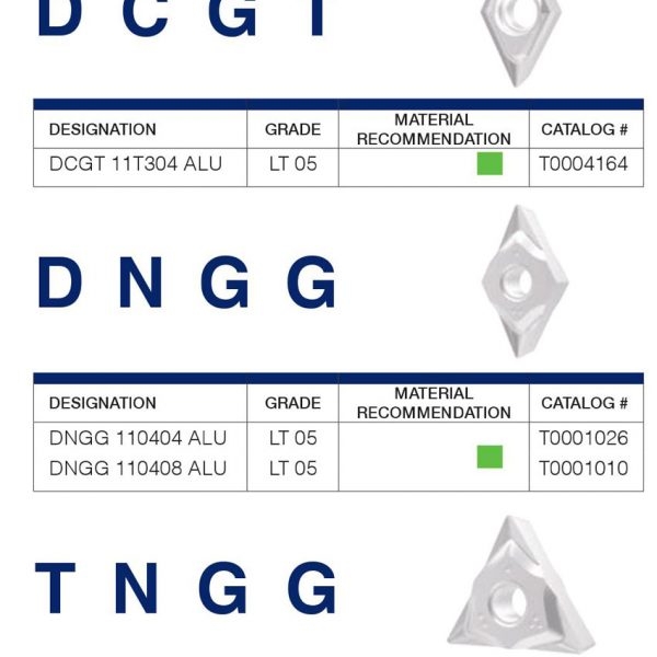– Các mã mảnh dao tiện nhôm của LAMINA bao gồm: CCGT 060204 ALU LT 05; CCGT 09T304 ALU LT 05; CNGG 09T304 ALU LT 05; CNGG 120404 ALU LT 05; CNGG 120408 ALU LT 05; DCGT 11T304 ALU LT 05; DNGG 110404 ALU LT 05; DNGG 110408 ALU LT 05; TNGG 160404 ALU LT 05; VNGG 160404 ALU LT 05; VNGG 160408 ALU LT 05; WNGG 060404 ALU LT 05; WNGG 060404 ALU LT 05.