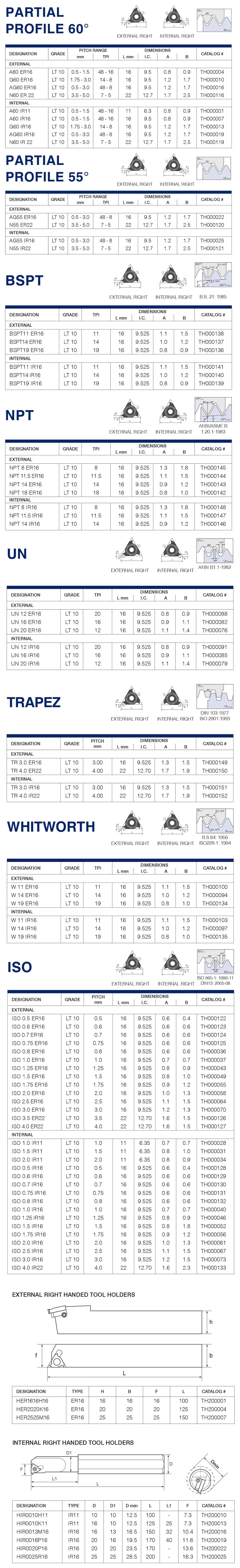 – Mảnh tiện ren của Lamina có thể tiện các kiểu ren hệ mét bước 0.5 đến 5.0 hoặc ren hệ Inch. Ren BSPT, NPT, UN, TRAPEZ, WHITWORTH, ISO.