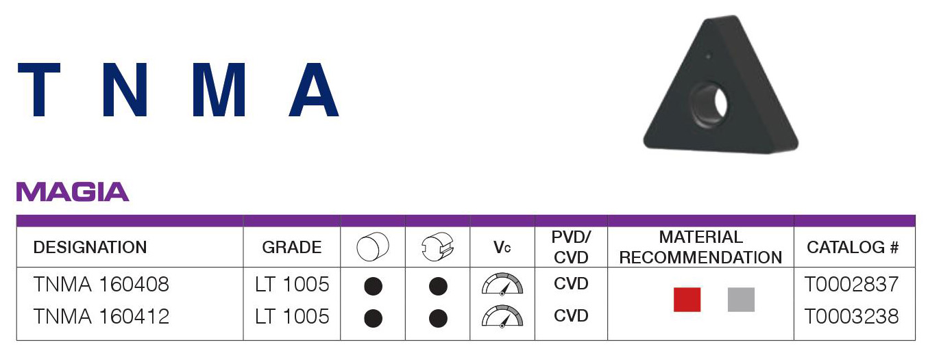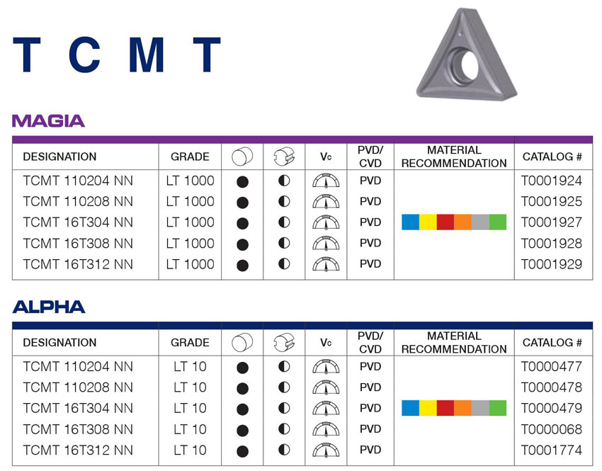– Các mảnh tiện tam giác TCMT; TNMA; TNMG; TNMP; TNUX; TPMR của LAMINA có thể tiện được các vật liệu: thép; inox; gang; hợp kim chịu nhiệt (titan, inconel); thép sau nhiệt luyện; nhôm, đồng,… (vật liệu phi kim loại).