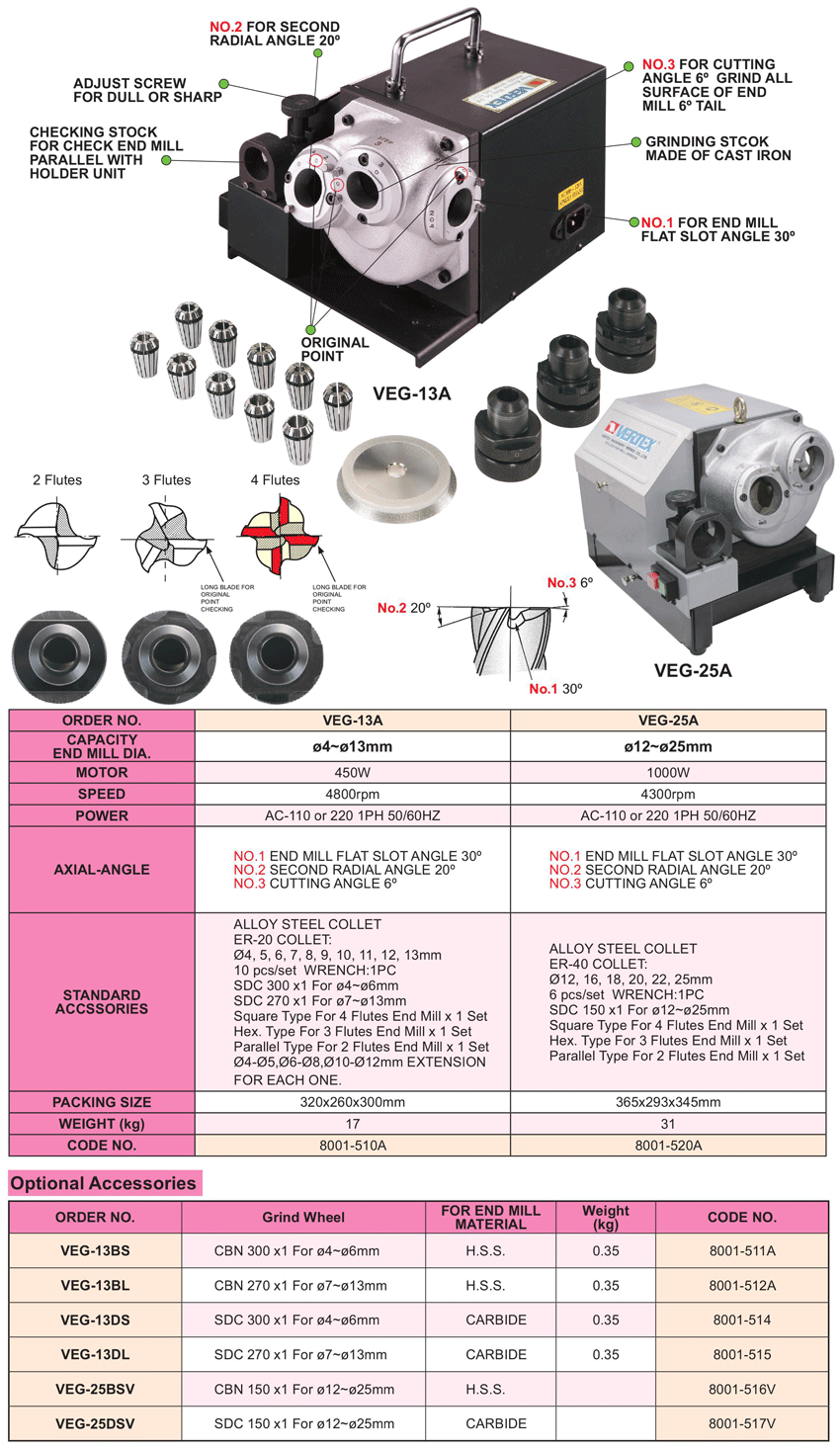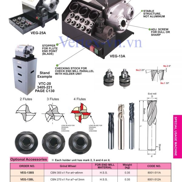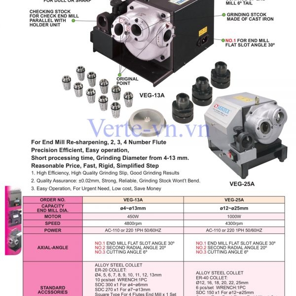 – Máy mài VEG-13A và VEG-13 mài được dao phay có đường kính từ 4 – 13mm.