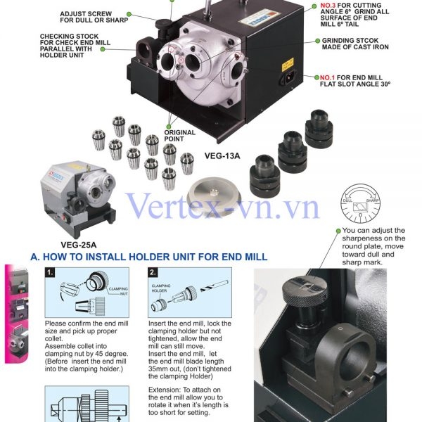 – Máy mài VEG-25A mài được dao phay có đường kính từ 12 – 25mm.