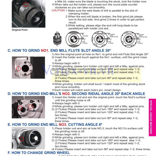 – Máy mài dao phay ngón chuyên dụng VERTEX mài được dao phay trụ 2 me, 3 me và 4 me cắt. Mài sắc 3 lưỡi cắt: 30°; 20°; 6°.