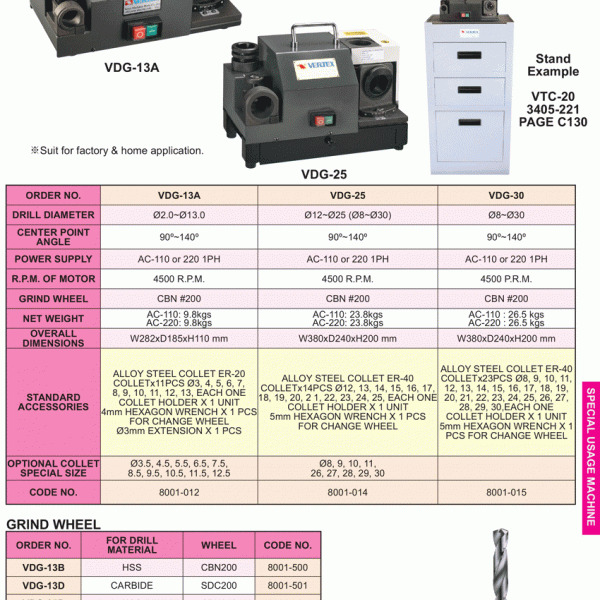 – Máy mài mũi khoan VDG-30 mài được mũi khoan có đường kính từ 8 – 30mm.