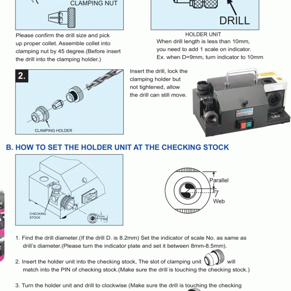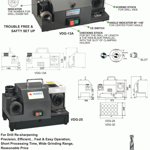 – Máy mài mũi khoan chuyên dụng VERTEX dùng mài sắc lại lưỡi cắt mũi khoan. Có thể trích lưỡi cắt ngang theo hốc mài từ trên xuống (thường sử dụng cho mũi khoan đường kính lớn).