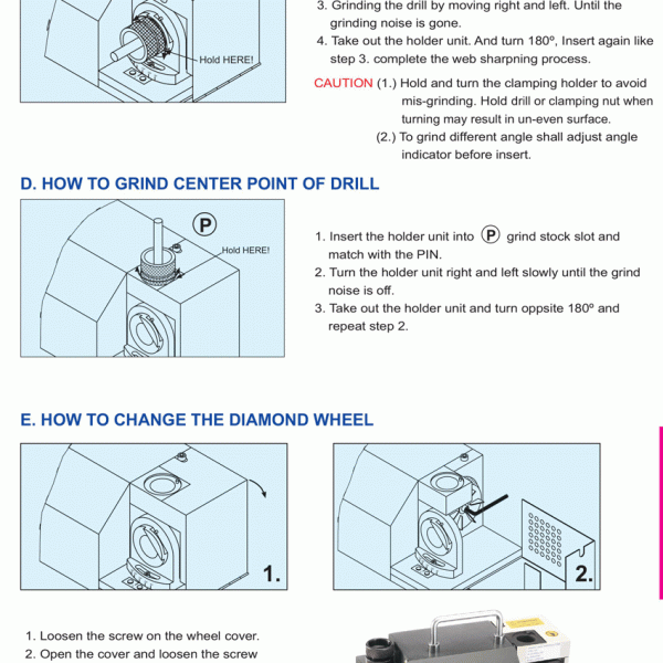 – Có thể điều chỉnh góc mài đầu mũi khoan từ 90° – 140° cho phù hợp với các mũi khoan gia công thép (118°), thép hợp kim (135°), đồng (90°) và nhôm (90°).