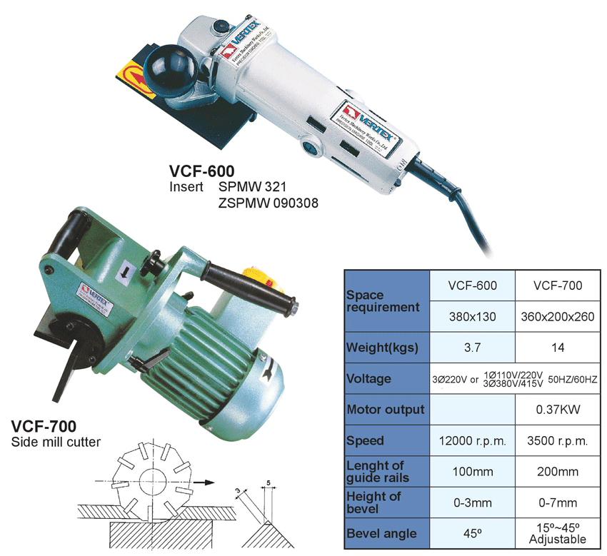 – Máy vát mép cầm tay VCF-700: Sử dụng mảnh dao hợp kim SPUN1203. Thích hợp cho thép và gang. Kích thước vát mép được 0-7mm. Góc vát mép được 15° ~ 45°.