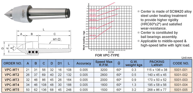 – Các mũi chống tâm máy tiện quay: VPC-MT1, VPC-MT2, VPC-MT3, VPC-MT4, VPC-MT5 thích hợp sử dụng cho tiện tốc độ quay trung bình và tốc độ quay cao với tải trọng nhẹ.