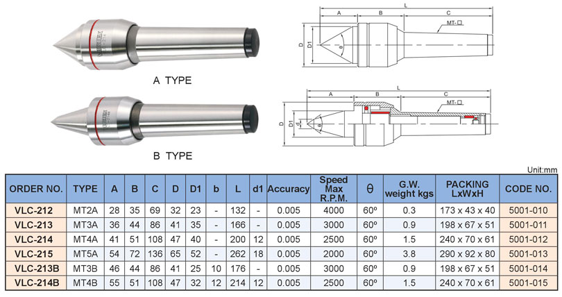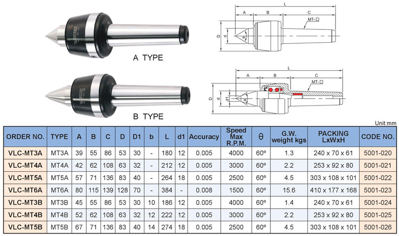 – Mũi chống tâm máy tiện tốc độ cao VLC-MT3A, VLC-MT4A, VLC-MT5A, VLC-MT6A, VLC-MT3B, VLC-MT4B, VLC-MT5B được sử dụng cho máy tiện và máy tiện NC tốc độ cao với tải trọng nặng, chống thấm nước.